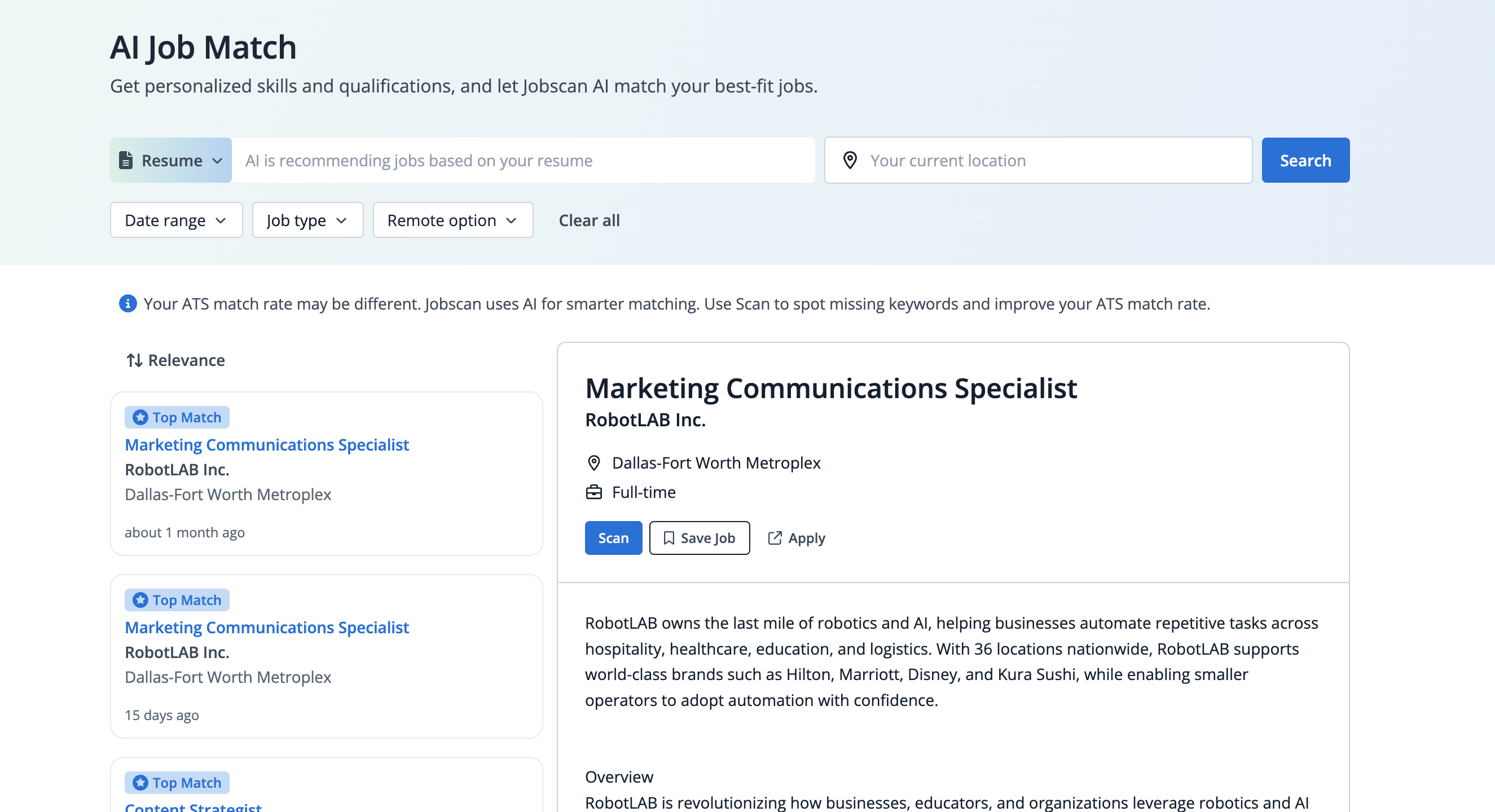 Jobscan’s intelligent Job Matcher analyzes your resume to find the jobs that you’re the best match for. You’ll see labels for Top Match and Good Match. Scan your resume to see your exact Match Rate and what improvements you can make before applying for the job.