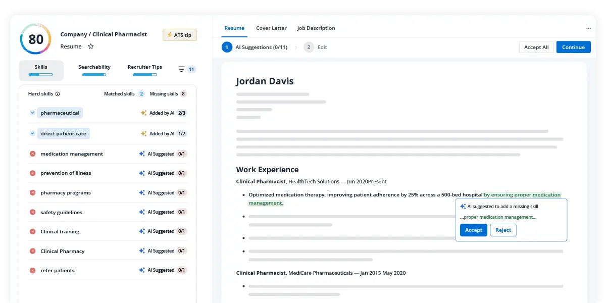 Watch your resume’s Match Rate increase in real-time as you accept suggestions.