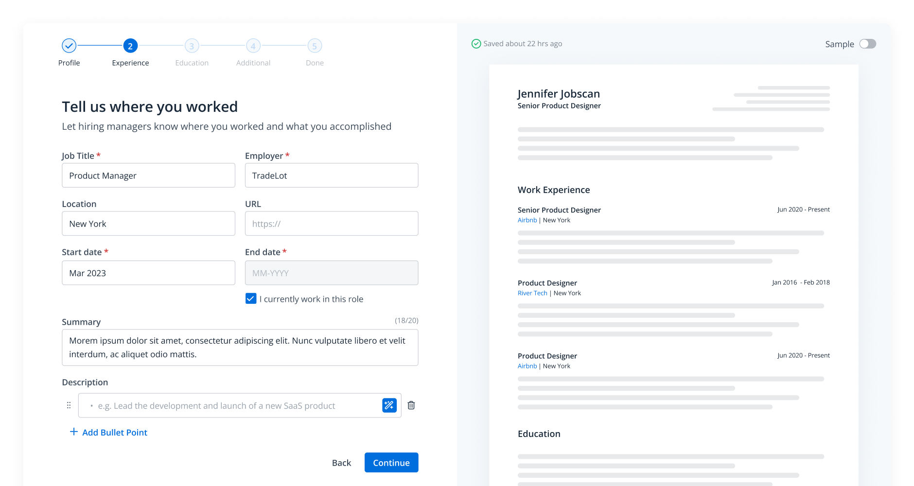 Quickly generate work experience bullet points that showcase your qualifications (paid version only).