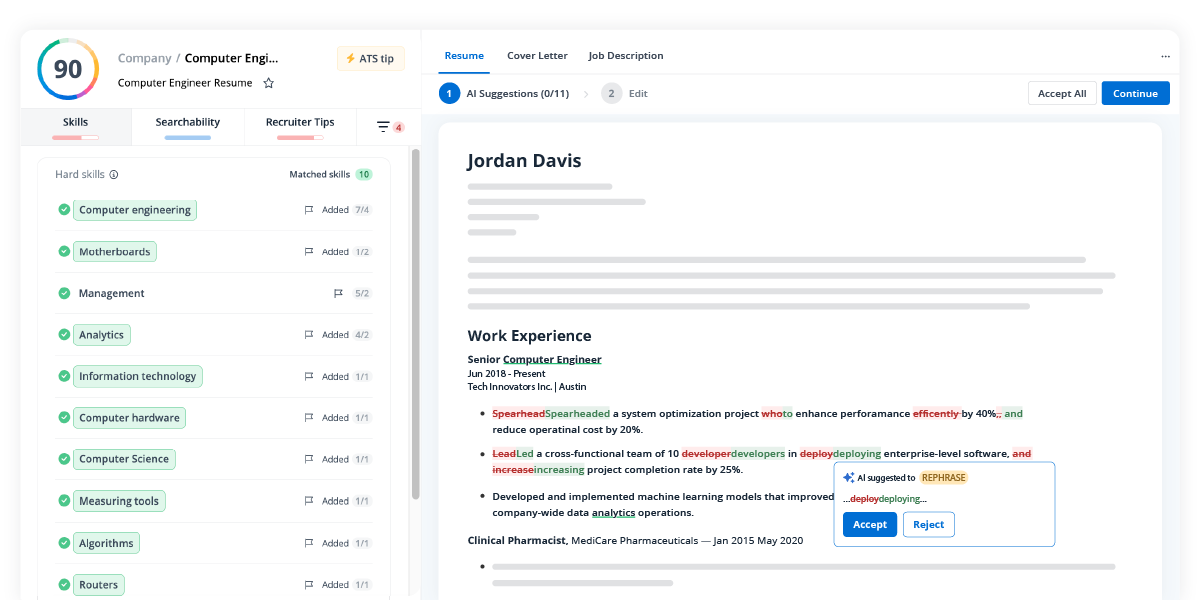 You are the expert on your career. Accept or reject any recommendation with a single click, ensuring your resume remains authentic to your voice while being perfectly polished.