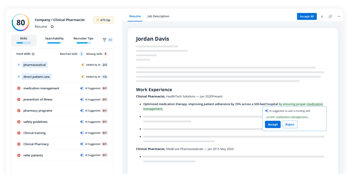 Our AI scans the role’s most important requirements and provides specific, actionable suggestions to improve your resume. You no longer have to waste time decoding what a hiring manager truly wants. This ensures your most relevant experience is front and center.